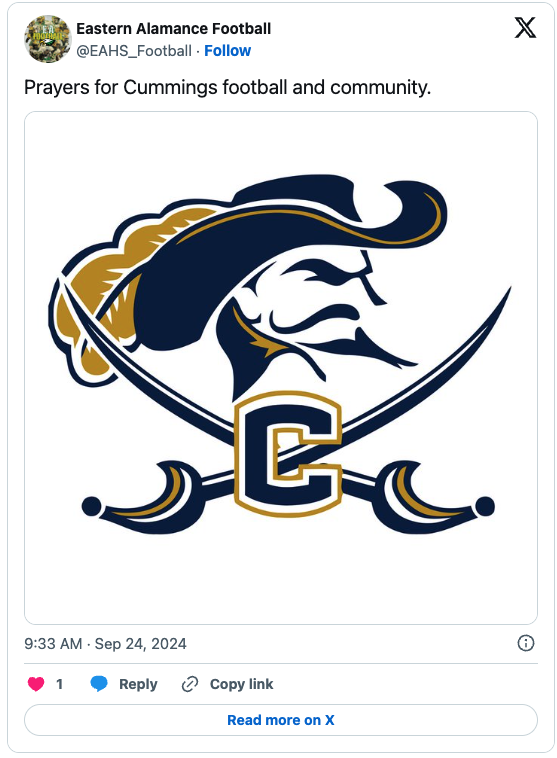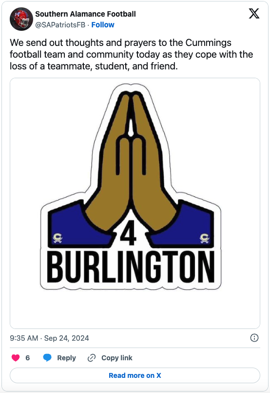 Local football teams have rallied around Cummings High School, sharing messages of solidarity and support. Southern Alamance football took to social media, posting, “We send out thoughts and prayers to the Cummings football team and community today as they cope with the loss of a teammate, student, and friend.” Similarly, Eastern Alamance football echoed these sentiments, offering prayers for the grieving community.