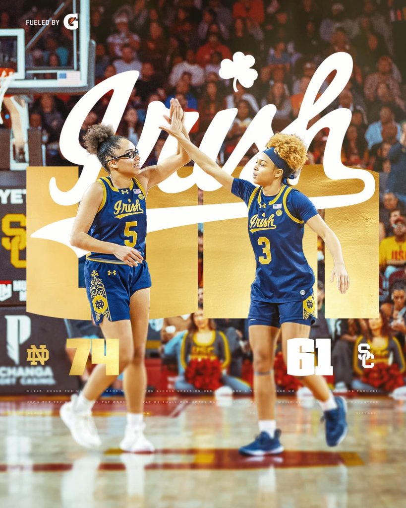 FROM LOS ANGELES — Hannah Hidalgo delivered a statement performance, scoring 24 points to lead No. 6 Notre Dame to a decisive 74-61 victory over third-ranked Southern California in a highly anticipated West Coast showdown on Saturday.