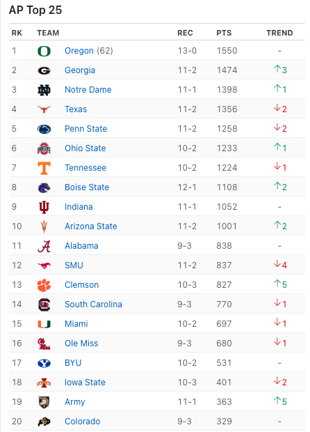 Yeah, I get the historical factor, but you can’t keep rewarding Alabama just for wearing the crimson jersey. The loss to Vanderbilt, in particular, is a killer. And while they played Georgia tough in the SEC Championship, that’s still not enough to justify keeping them at No. 11. Alabama just hasn’t been consistent enough to earn that spot. Teams like Arizona State, Clemson, and even Texas had better overall seasons.