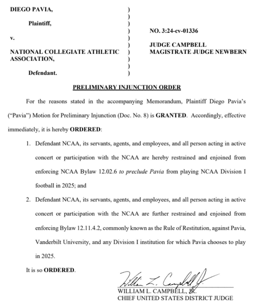 Diego Pavia, Vanderbilt’s quarterback, has won a significant legal victory against the NCAA. A federal judge granted Pavia a preliminary injunction, allowing him to play in the 2025 season without his junior college (JUCO) years counting against his NCAA eligibility. This ruling stems from Pavia’s lawsuit challenging the NCAA’s eligibility rules for former JUCO athletes, arguing that they violate antitrust laws. The court’s decision blocks the NCAA from enforcing its bylaws that would preclude Pavia from playing NCAA Division I football in 2025.